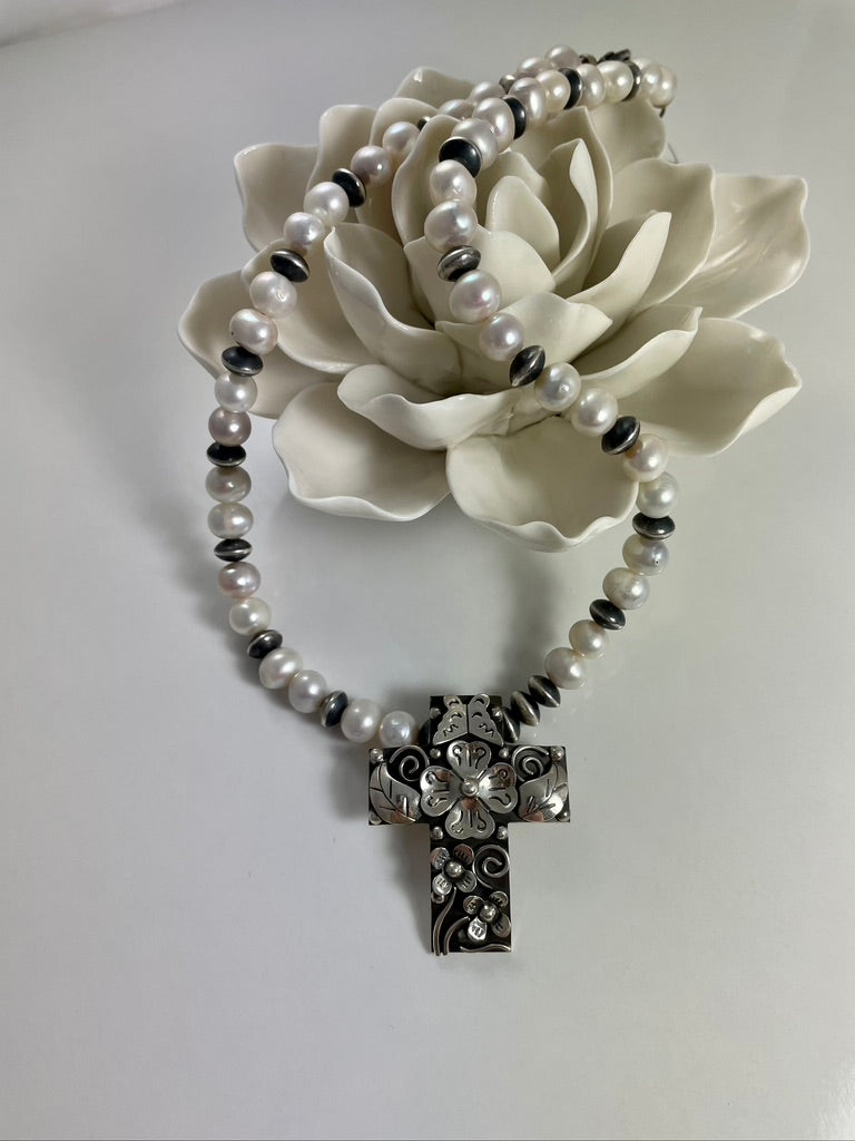 Freshwater pearls and crystals cross blue topaz chalcedony